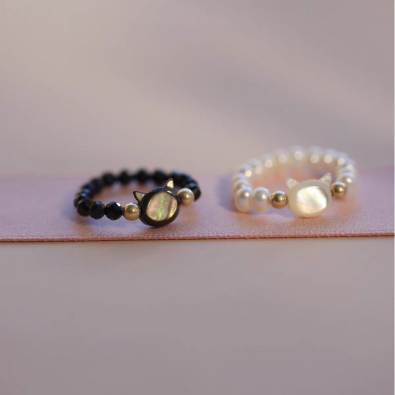 極細黒猫指輪日系水晶石黒尖晶個性珠串指環猫リング