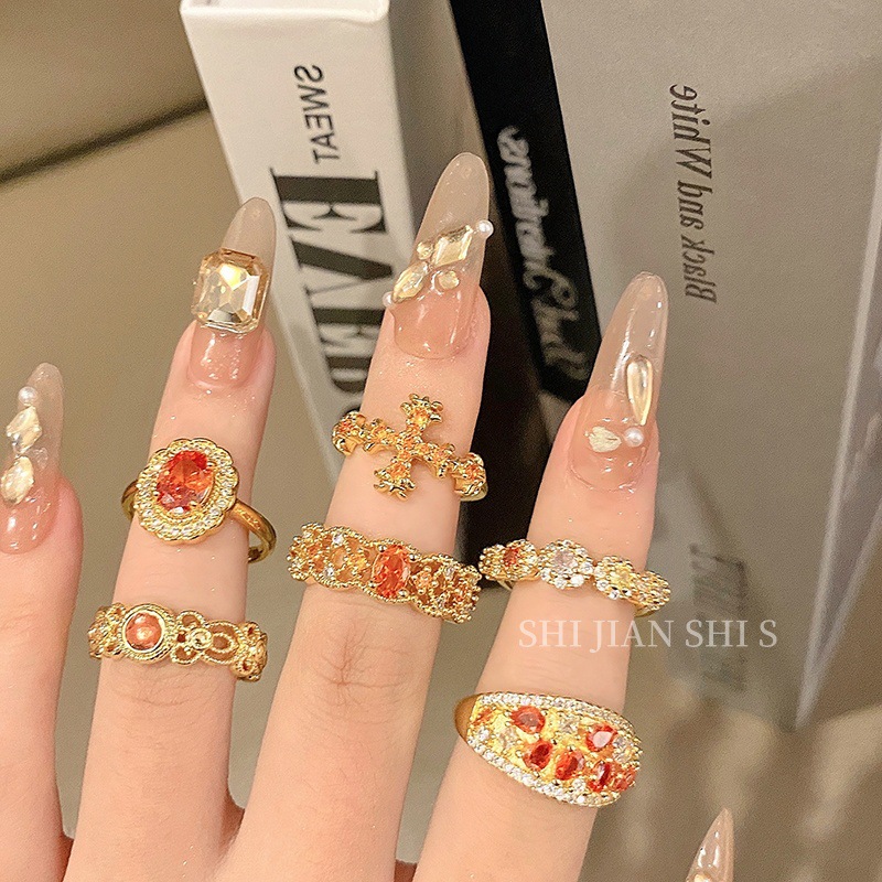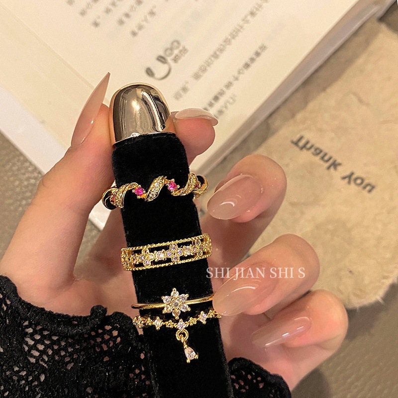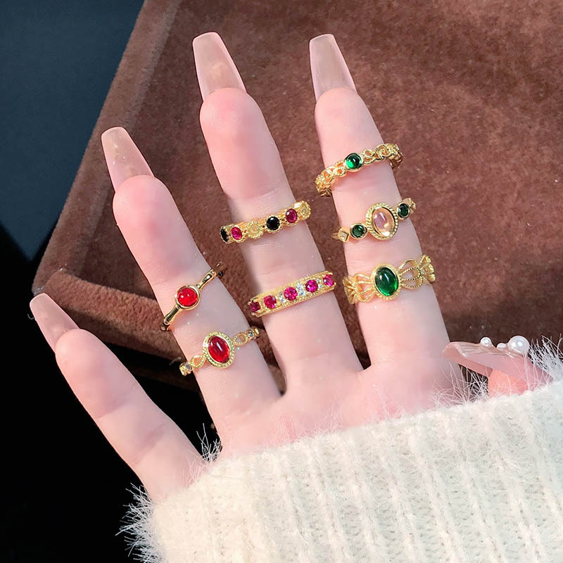レトロな日本製マイクロ象嵌ザクロレッドカラーダイヤモンドリング女性用ニッチ中空レーススタッキング絶妙な人差し指リングアクセサリー