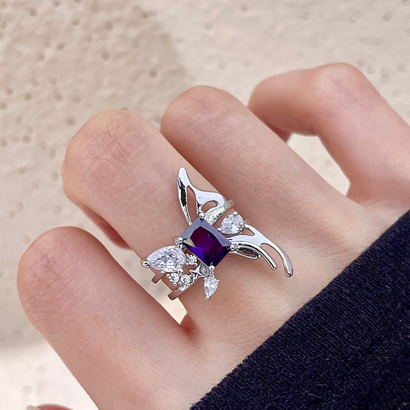 紫色のジルコンの超きらめく開口戒の非対称性の液体の蝶の指輪の少女の甘い気質の食指の戒潮の装飾