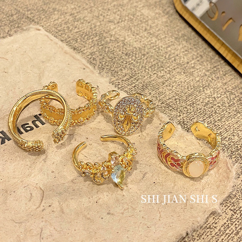 ライトラグジュアリーヴィンテージ宮殿スタイルのテクスチャー彫刻象嵌オープンリング女性用レトロ中空エア品質多用途リング