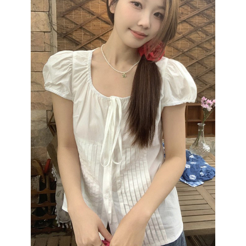 ホワイトパフスリーブシャツ女性のための 2025 夏の新しいルーズスリムレースアップシャツデザイン U ネックトップ夏