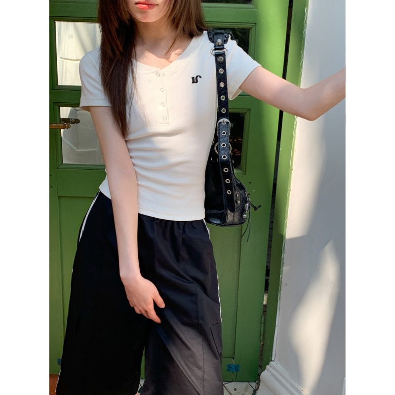 女性用半袖右肩Tシャツ2025夏新作スリムフィットアメリカンレトロデザインボタン半袖トップ