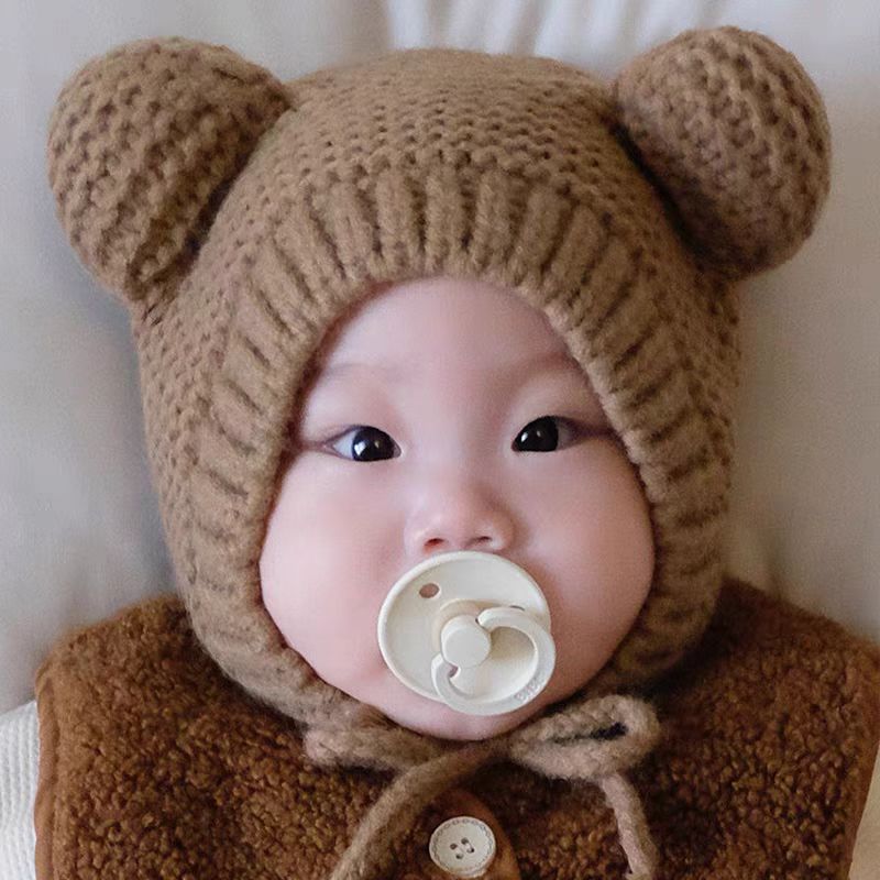 ベビー帽子秋と冬暖かいウール帽子かわいい赤ちゃん男の子と女の子クマ耳保護冬耳保護ニット帽子
