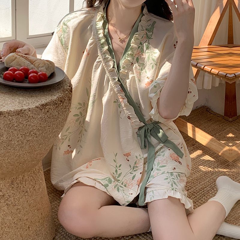 クラウドコットンパジャマ女性の夏のレトロな新しいカーディガン半袖スーツ甘いシンプルな学生は家の服の外で着用できます