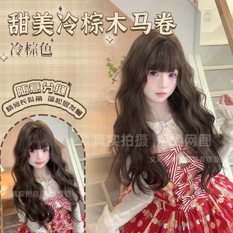 制覇かつら女長髪冷茶色長巻き髪Lolitaネット赤丸顔日常自然ふわふわ全頭セット女