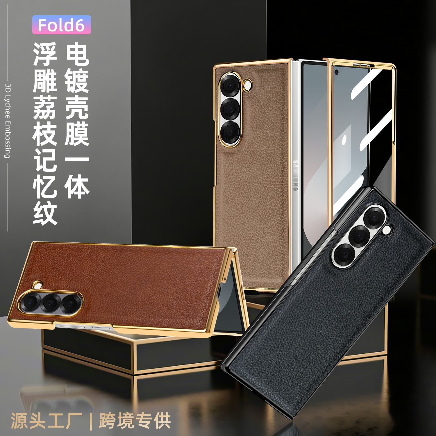 工場卸売サムスンfold6電気メッキ落下防止携帯電話ケースライチパターン折りたたみスクリーンfold5保護レザーケースに適しています