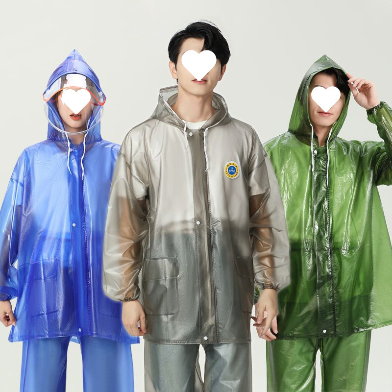 厚みのある屋外透明プラスチックレインコートとレインパンツセット、ポンチョとつば付きダブルシーラバーのファッショナブルな分割電気自動車防護服