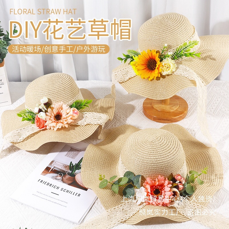 ドライフラワー麦わら帽子 diy 手作り素材パッケージペースト絵画落書き絵画花帽子幼稚園中秋節ギフト