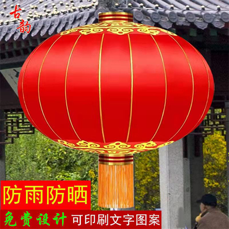 新年のバルコニーの入り口に新しい大きな赤い提灯、屋外装飾用の提灯のペア、フロックサテン