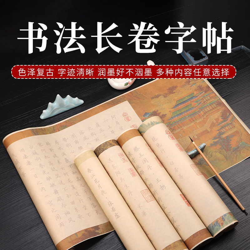 書道の長い巻の字の帖は小さい楷書の書道の字をまねて赤い顔の真卿の毛筆の古い絵の長い巻を描いて紙をまねます。