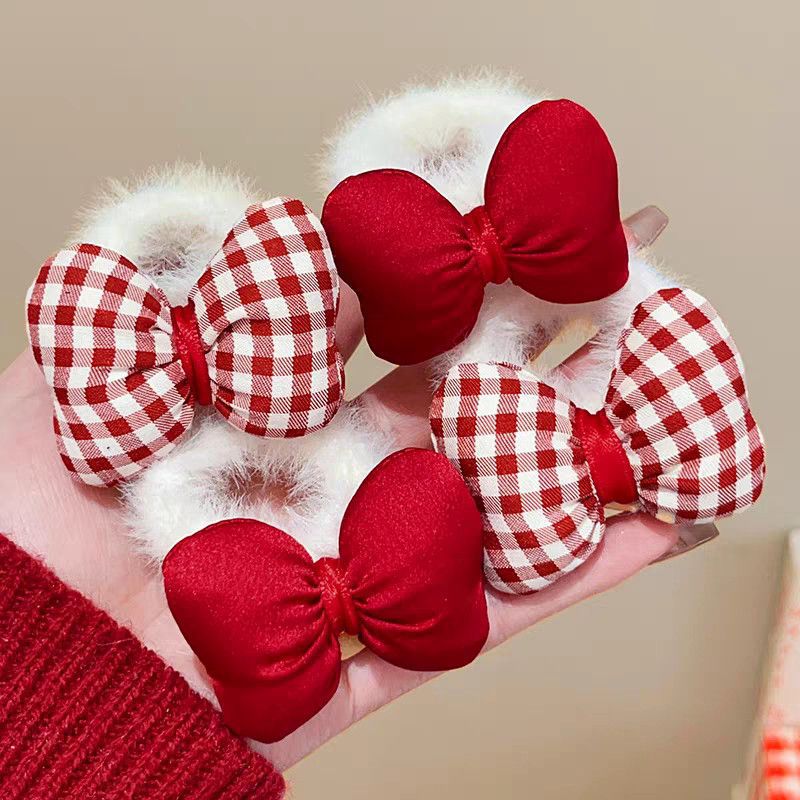 新年の赤い蝶結びのぬいぐるみの子供は髪のひもを傷つけません。