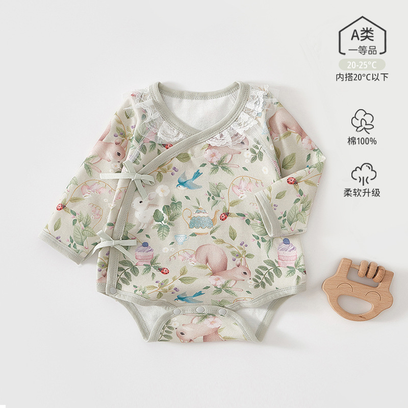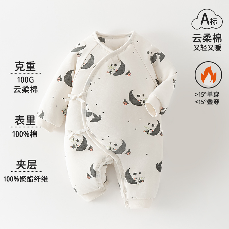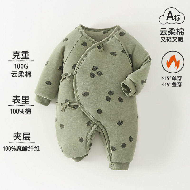 赤ちゃん服秋冬新生児連体服の斜め襟に綿を挟んだ蝶々衣が付いています。