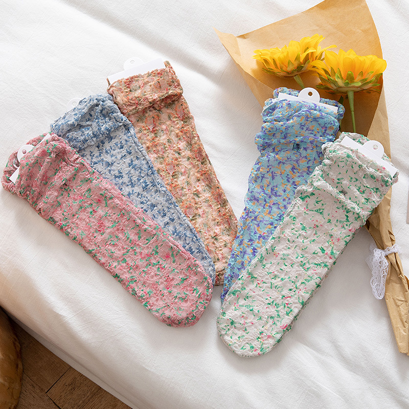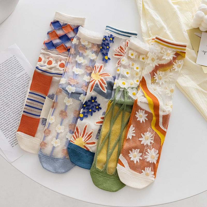 夏の靴下の女性の超薄水晶ガラスの糸の中筒の靴下のinsの潮の甘い小さい花のネットの赤いストッキングの綿の底は汗を吸います。