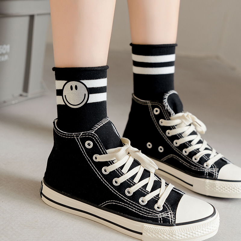 靴下の女性の靴下の綿の中筒の春と秋の韓国のかわいいホットスタンプの笑顔の靴下の新商品の学院の風の緩い口のストライプのストッキングの潮