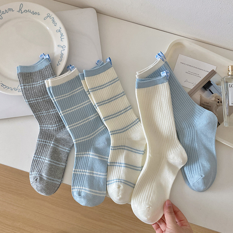 チェック柄リボンソックスレディースミッドカーフソックス春夏薄い無地綿甘いメッシュレースソックスロリータ