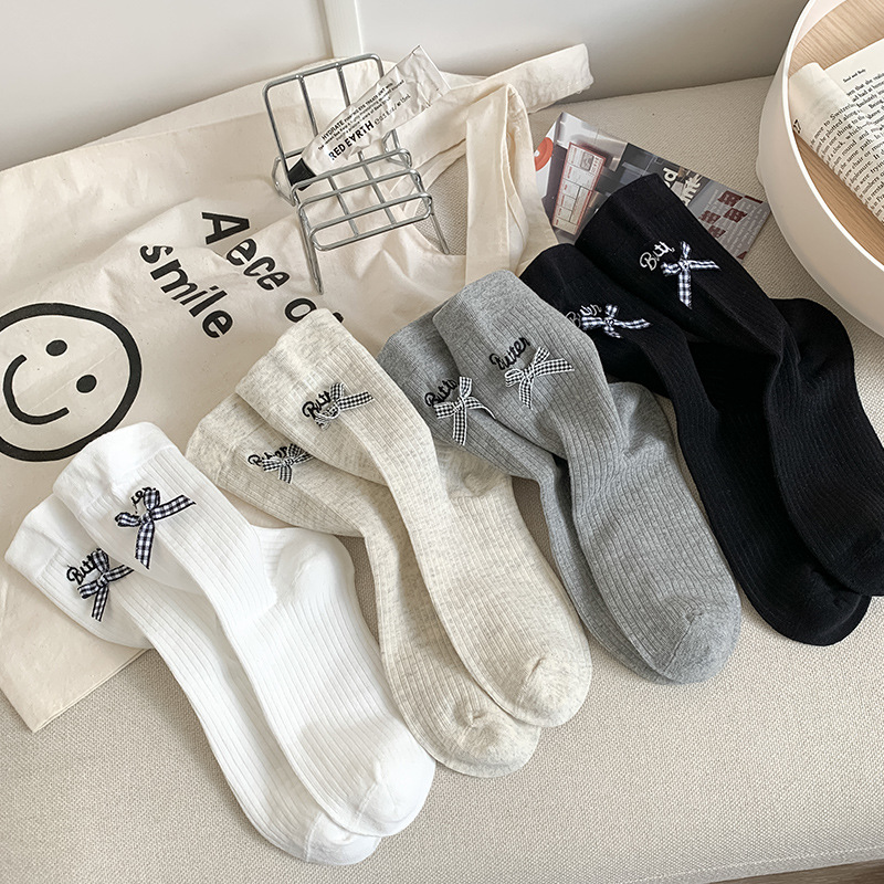 チェック柄のリボンソックス、女性用ミッドカーフソックス、春夏の薄いスタイル、小さな革靴、多用途のグレーのトレンディな韓国スタイルの女の子用ソックス