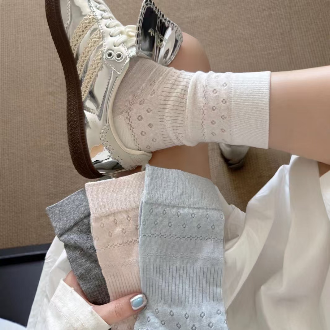 夏の靴下の女性の薄いタイプの中筒の積み重ねの靴下insの潮の泡のレースの透かし彫りの薄い骨のない純色の韓国の靴下の綿