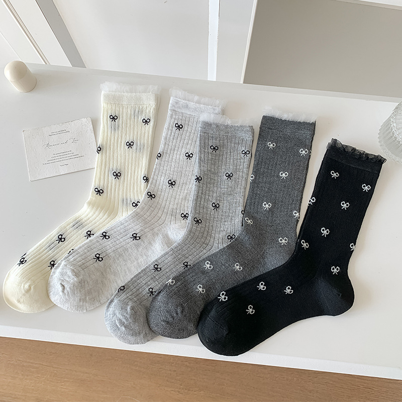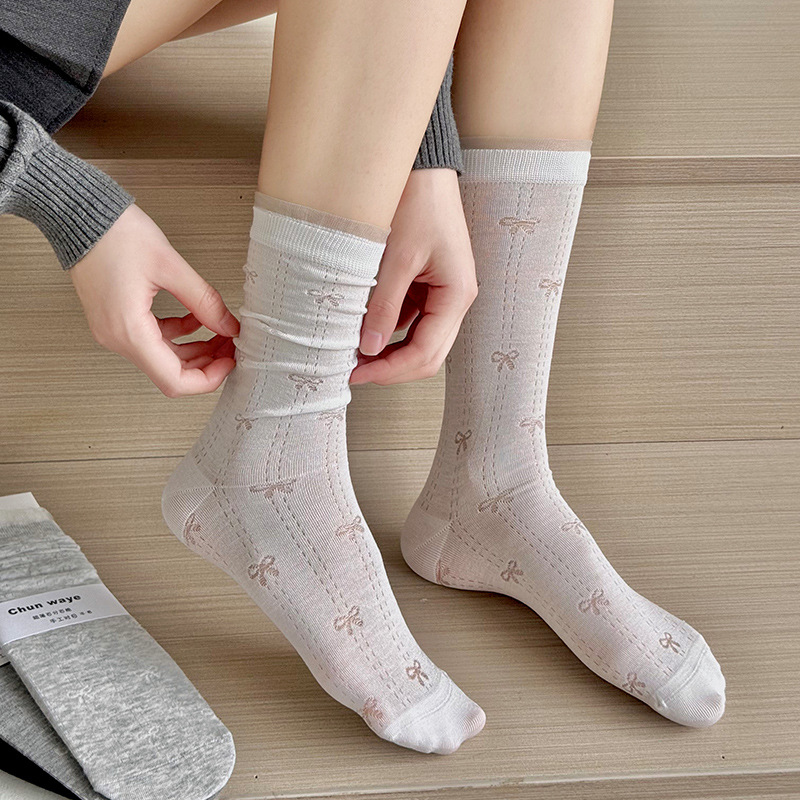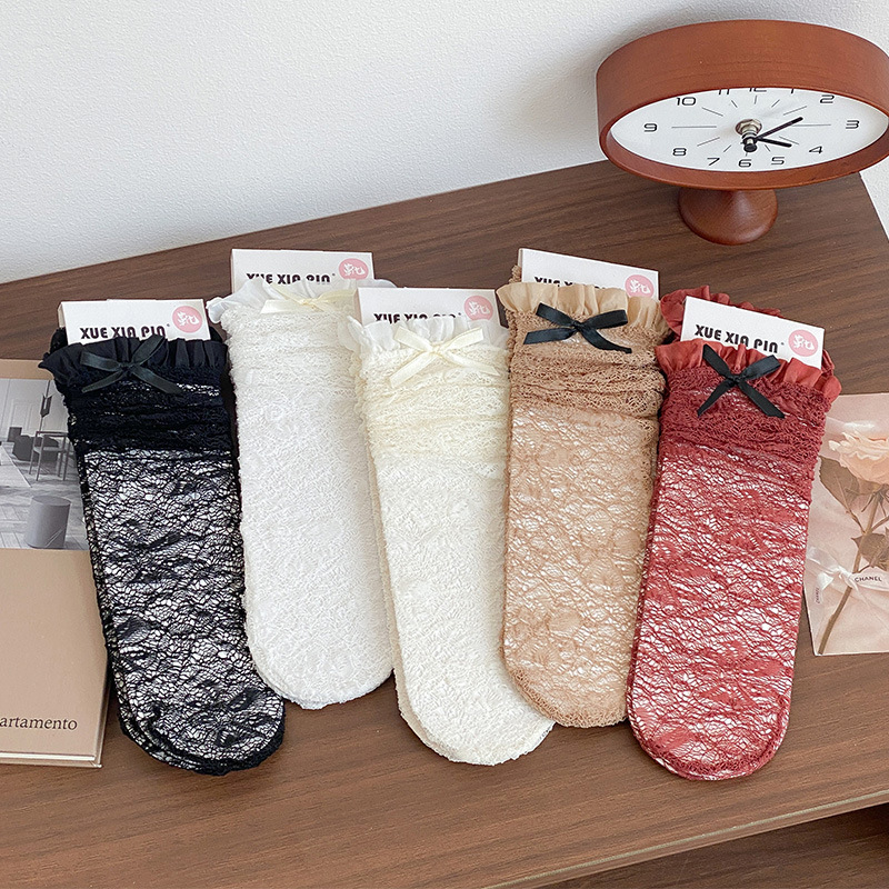 蝶結びの靴下の女性の夏の薄いタイプの2025新型のネットの赤い山の靴下の女性は小さい靴のレースの長い筒を組み合わせます。