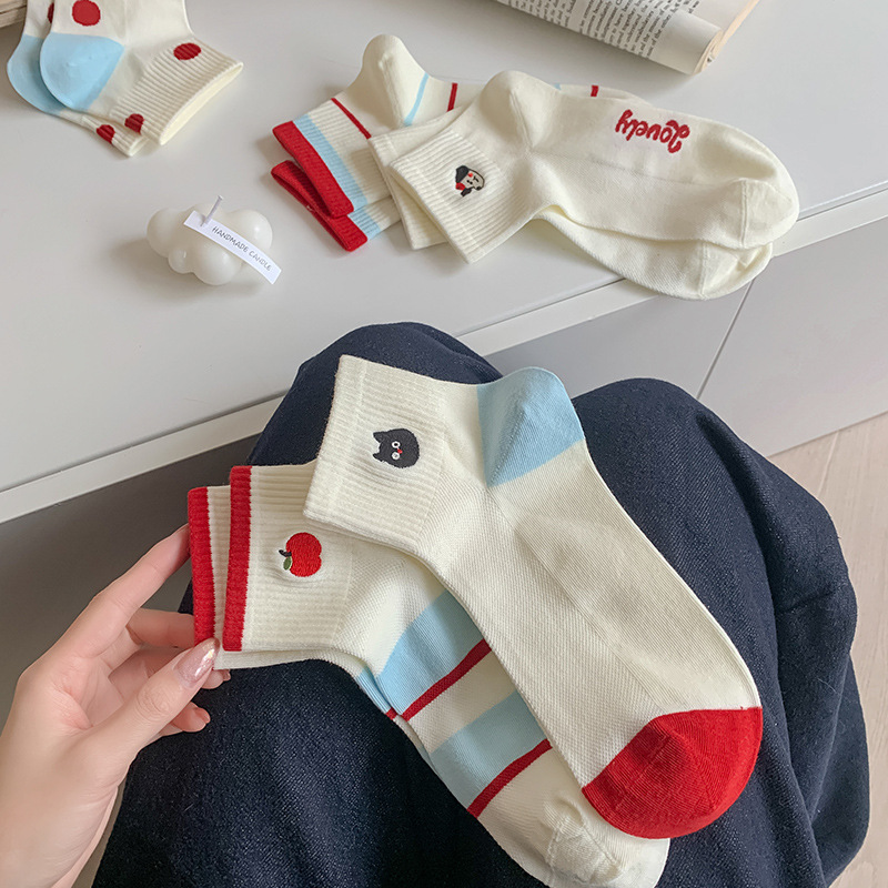 女性用ショートソックス春夏薄いメッシュ赤と青の刺繍かわいい子犬夏の新しい韓国スタイルの小中チューブ綿の靴下トレンディ