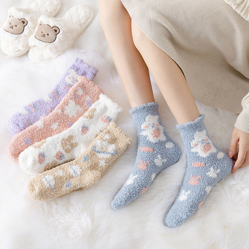 靴下の女性冬のかわいいサンゴのベルベットのストッキングは暖かい冬の睡眠の靴下の漫画のウサギの女子学生の厚い靴下の長さを厚くします。