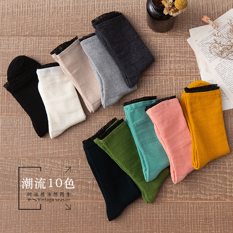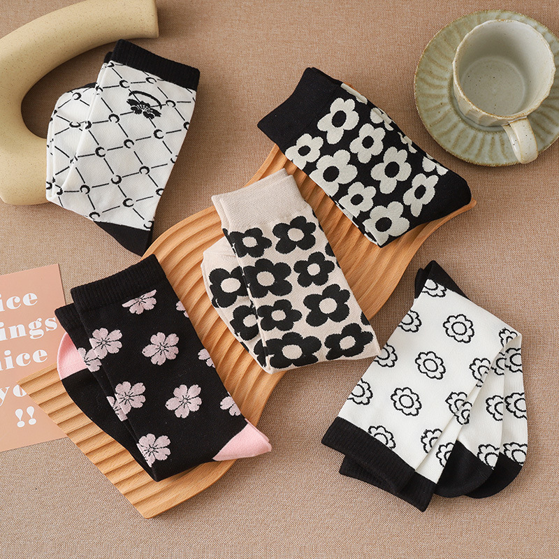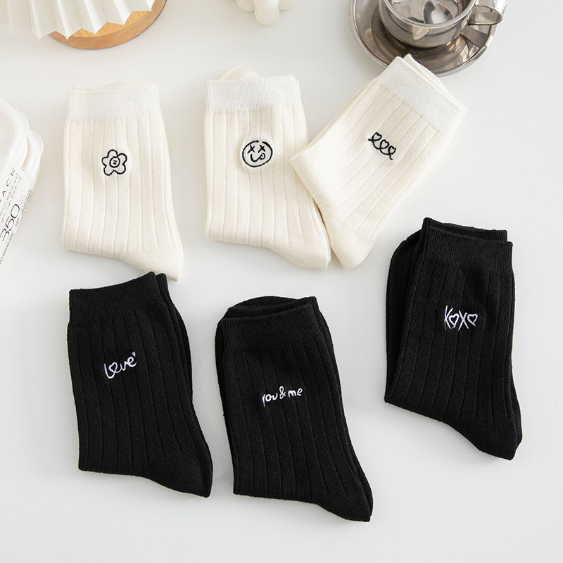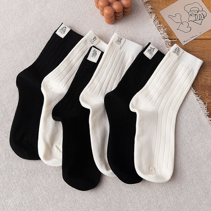双針刺繍靴下子供の中筒靴下純綿秋冬白黒シンプル女性綿靴下韓国版カジュアルjkストッキング