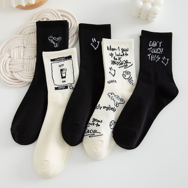 靴下の女性ins潮中筒靴下のアルファベットの小さい恐竜の落書きのファッションの靴下の学生の秋の外は百合のストッキングの白黒を着ます。