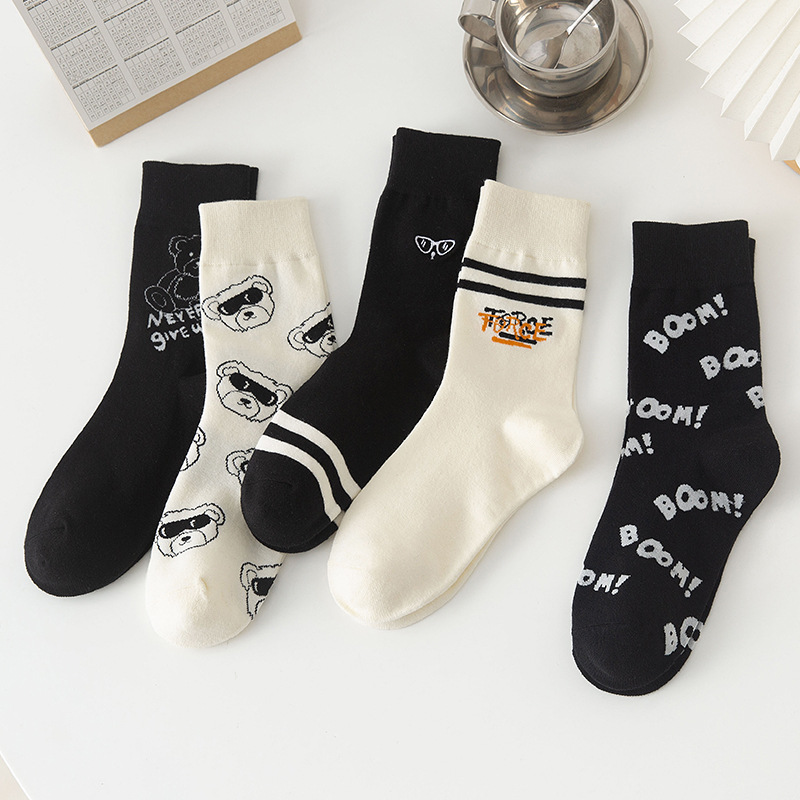 靴下の女性の秋冬の中筒の靴下のinsの潮流のかわいい熊の靴下の韓国版の学院の風の日本の純綿の白黒のストッキング