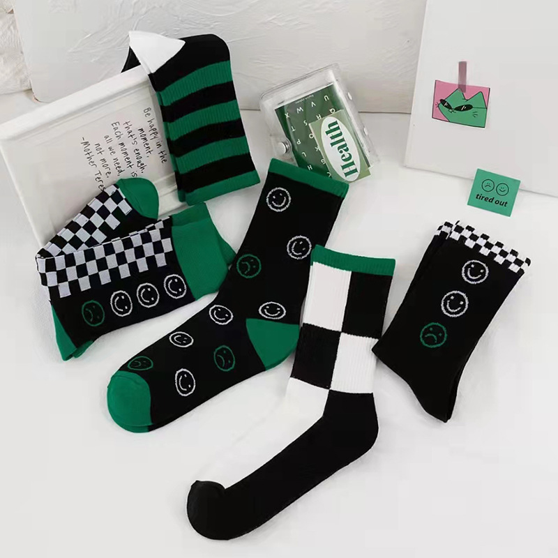 グリーン棋盤格靴下女性秋冬中筒靴下ins潮百合韓国笑顔靴下ネットレッド長筒外着