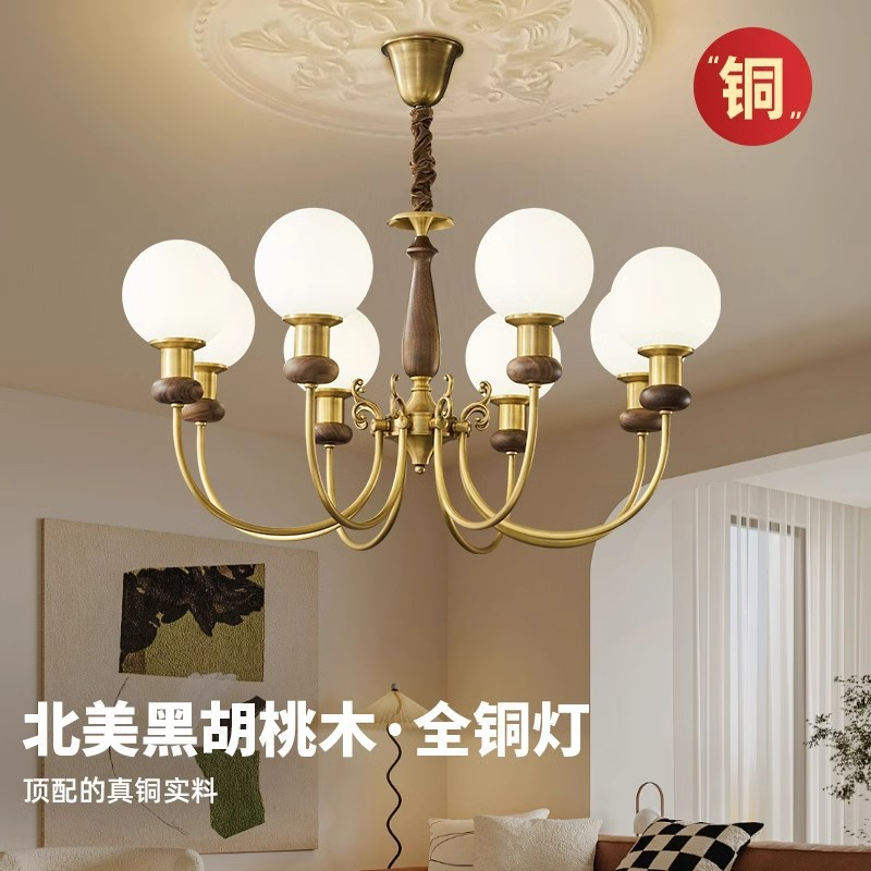 全銅中古アメリカンレトロリビングルームシャンデリア無垢材ハイエンド北米ブラックウォールナット2025新しいスタイルレストラン寝室
