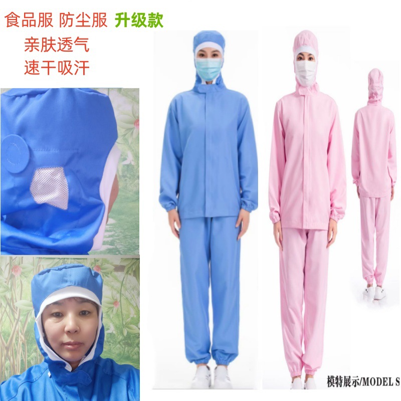 食品服のアップグレードの作業服セットと帽子工場のグルメ加工コートの防塵服はロゴを印刷できます。