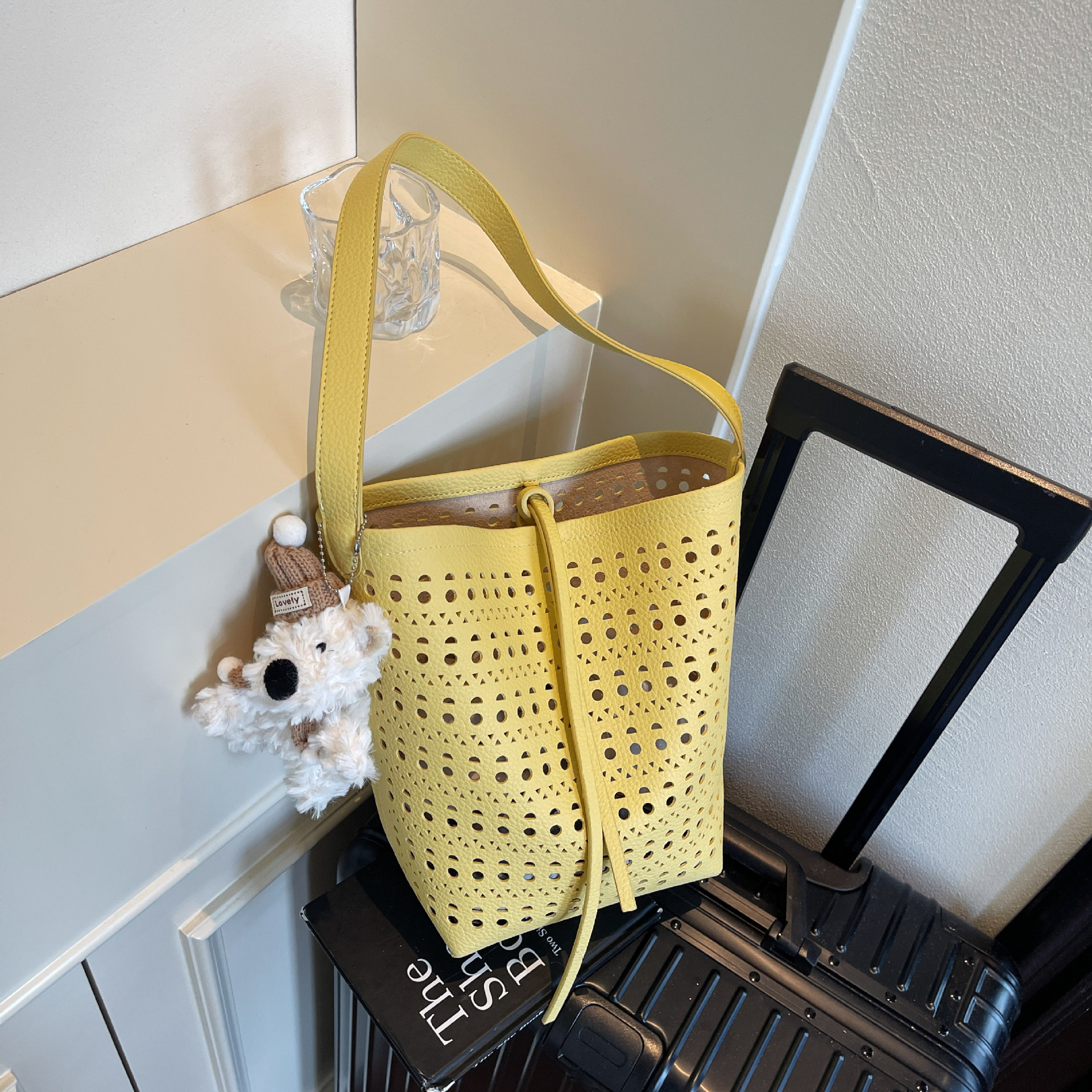 韓国のシンプルなニッチバケットバッグ中空織りショルダー通勤女性の新しいファッション大容量気質クロスボディバッグ