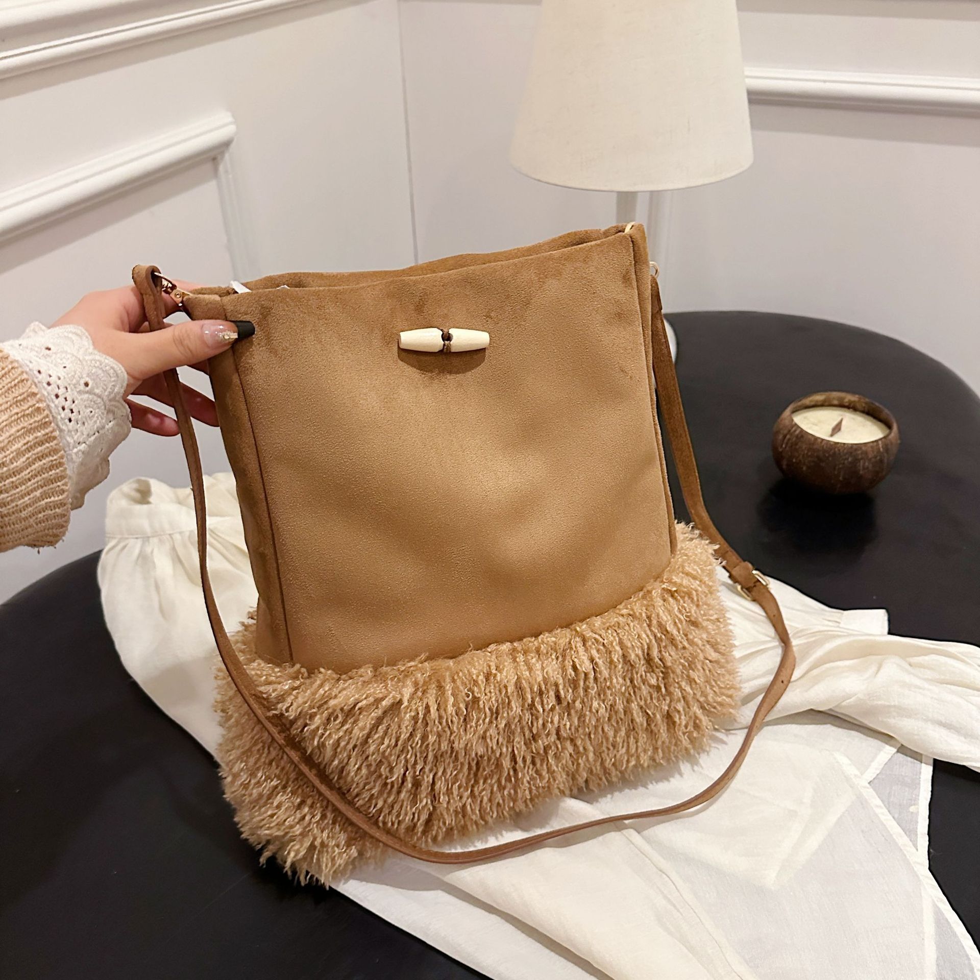 小衆流蘇毛バケツバッグクロスボーダースエード秋冬百合脇下包羊小毛通勤シングルショルダー