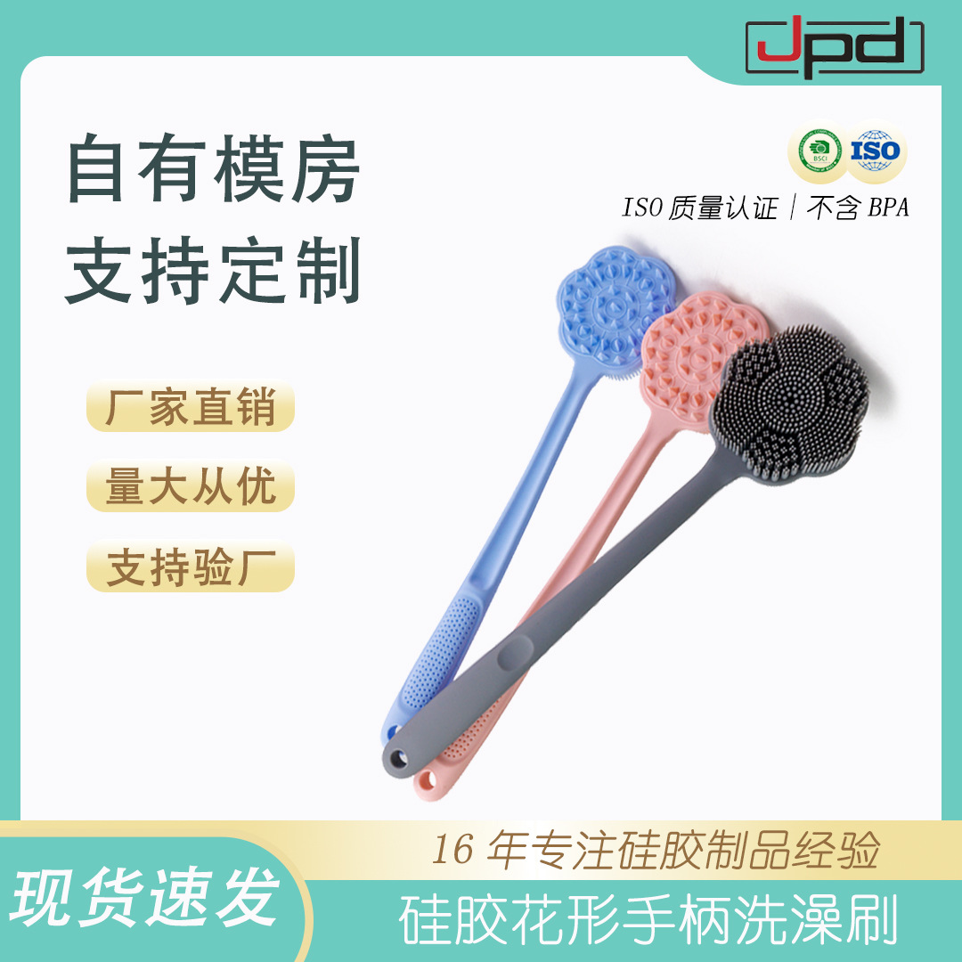 国境を越えた人気のかわいい花の形をしたロングハンドルバスブラシシリコンソフト毛バスルームマッサージとバスツーインワンバスブラシ
