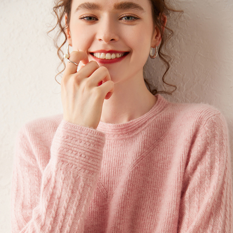 2024秋冬の新型の双股の厚い山の羊の絨毯の女性の丸首のねじのきしむの花のプルオーバーのセーターは底のニットを打ちます。