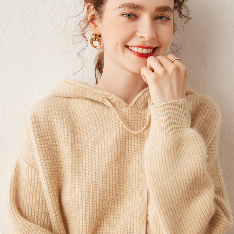 2024新型カシミヤフード付きの女性のゆるい秋冬セーターコートの純色ニットはカシミヤフードを厚くした