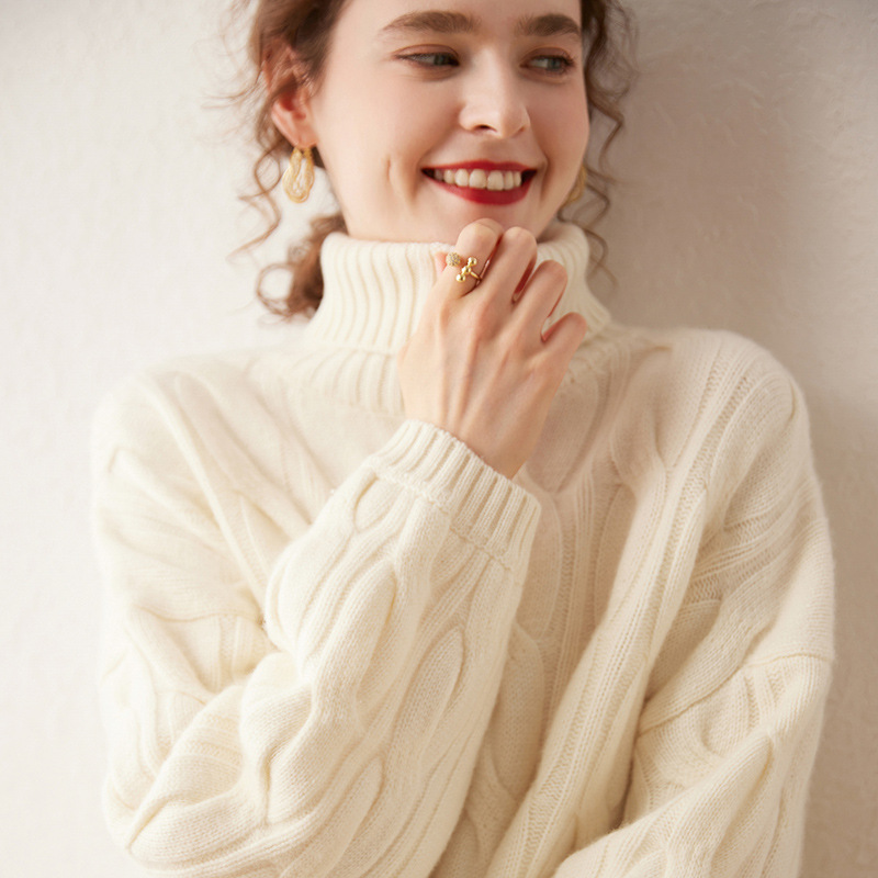 ゆったりとした怠惰な山のカシミヤのシャツの女性はやせている保温のセーターの半高襟の厚いニットの底のシャツの柔らかいモチモチとした肌に見えます。