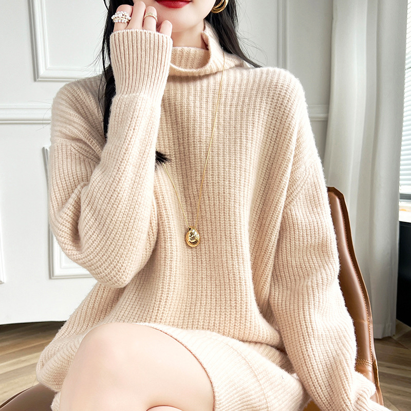 2024秋冬の新モデルのカシミヤの女性の高襟の100純のウールのセーターのゆったりしている中の長いタイプの簡単な底のニットの服