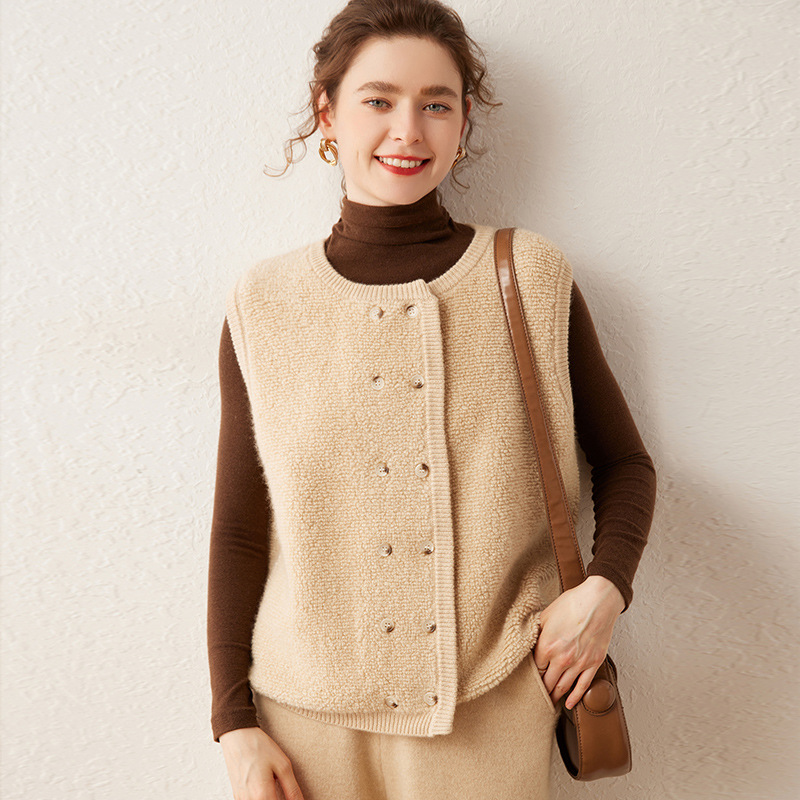 秋冬のダブルボタンのカシミヤのニットのカーディガンのベストの女性の丸首の純色は厚くてゆったりとしています。