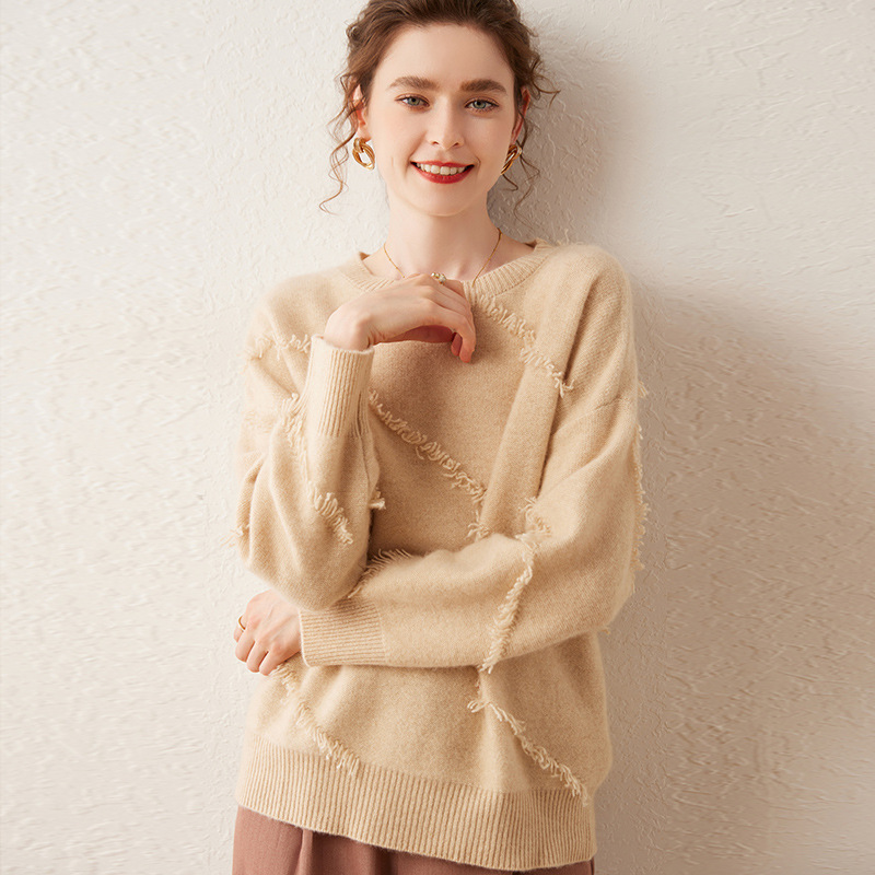 フランスの手作りの流蘇山のカシミヤのシャツの女性の丸首の秋冬の厚いセーターのゆったりしている怠惰な風のプルオーバーのニットは底を打ちます。