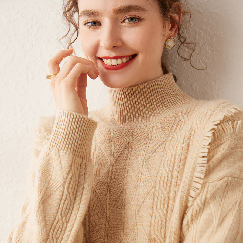 2024秋冬モデルの双株は厚いフリンジの半高襟の山のカシミヤのシャツの女性のファッションのカジュアルな花のセーターのニット