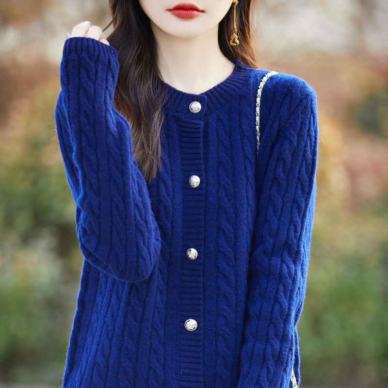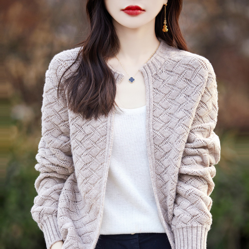 2024秋冬新作純ウールカーディガン女性丸首外付け長袖純色ゆったり女性メリヤスカシミヤコート