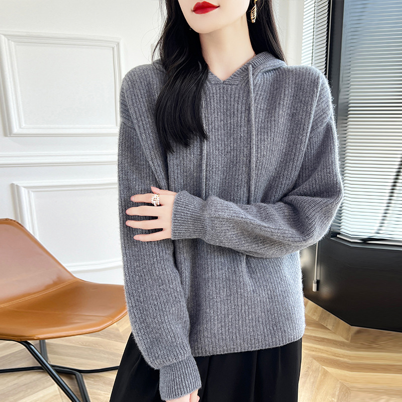 中長のフード付きニットウェアの女性秋冬の新型厚手セーターはゆったりしていて、怠惰な100ウールのシャツを着ています