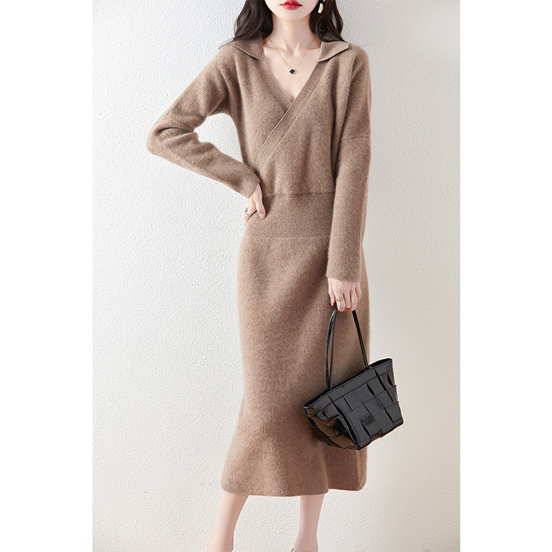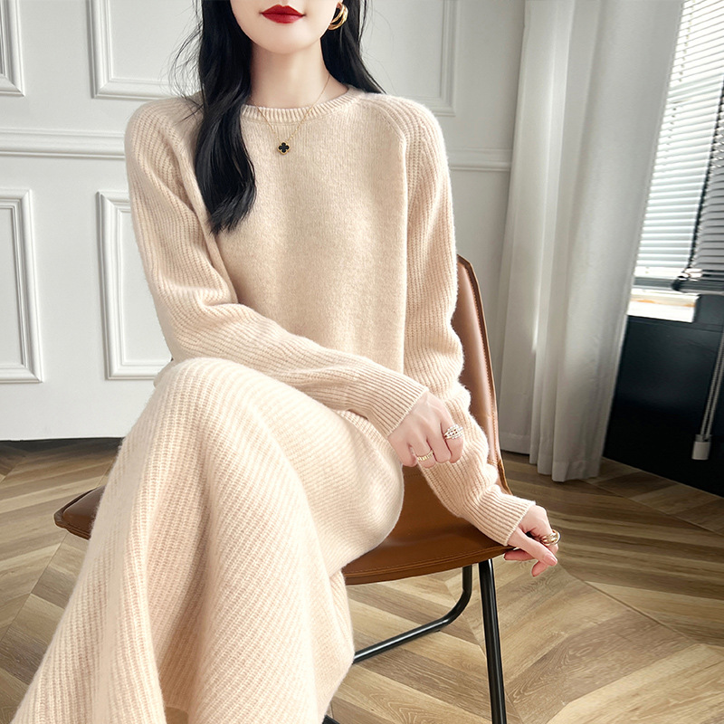 100純ウールニットセーターワンピース女性秋冬新作小襟膝カシミヤ長袖セーター女性