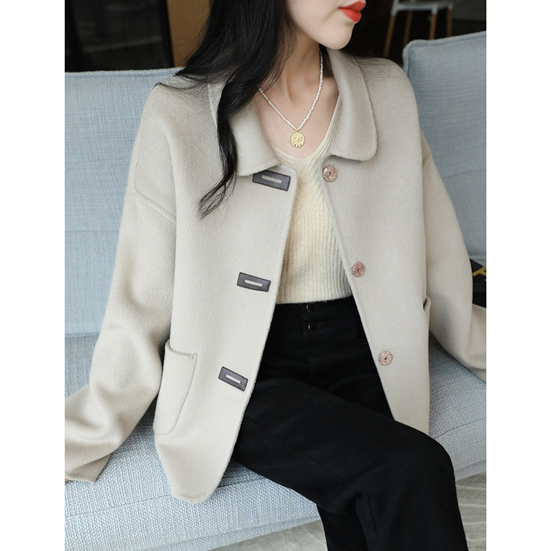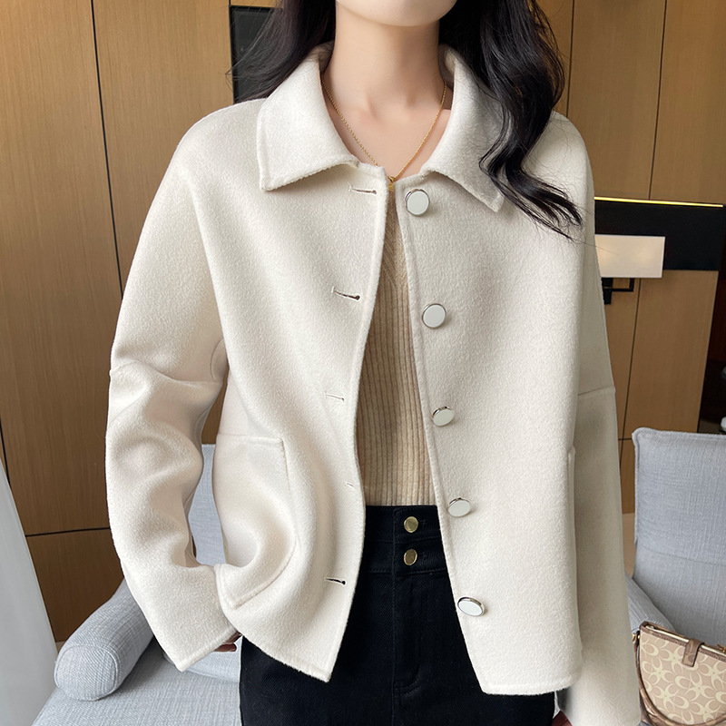 2024種類の秋冬の両面のカシミヤのコートの女性は襟の短いタイプの小さい背の高級感の純粋なウールのラシャのコートをひっくり返します。