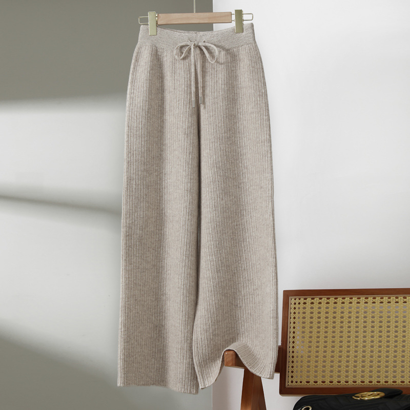 100純ウール厚手縦条ジャカード広脚ズボン秋冬直筒百合高腰純色カシミヤニットズボン女