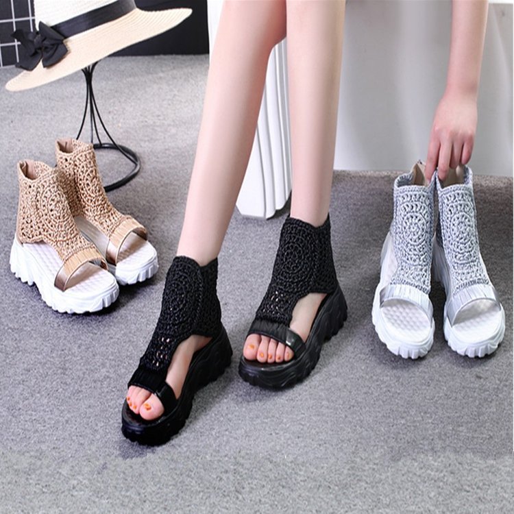 外国貿易の大きいサイズの草はハイヒールのサンダルの女性の2023新型の厚い底の魚の口のローマの靴を編みます。