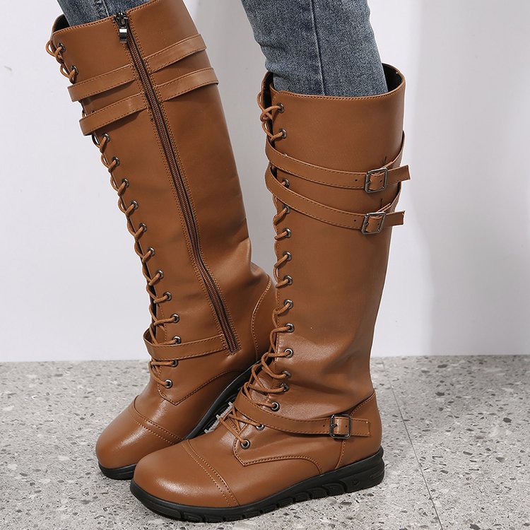 欧米の新型の外国貿易の大きいサイズの騎士の靴の女性の低いかかとの平底の丸い頭のベルトのバックルの交差するひものブーツの独立している駅