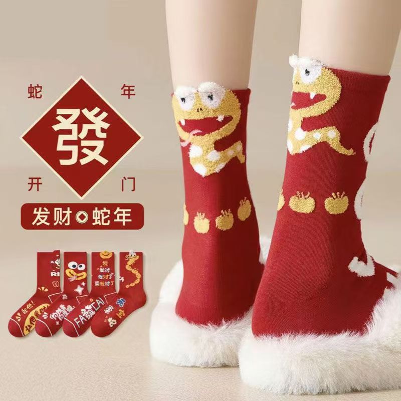 蛇の年の本命年の大きい赤い靴下の男女の1対の赤い靴下の中筒2025新年の蛇の秋冬のタイプのストッキング