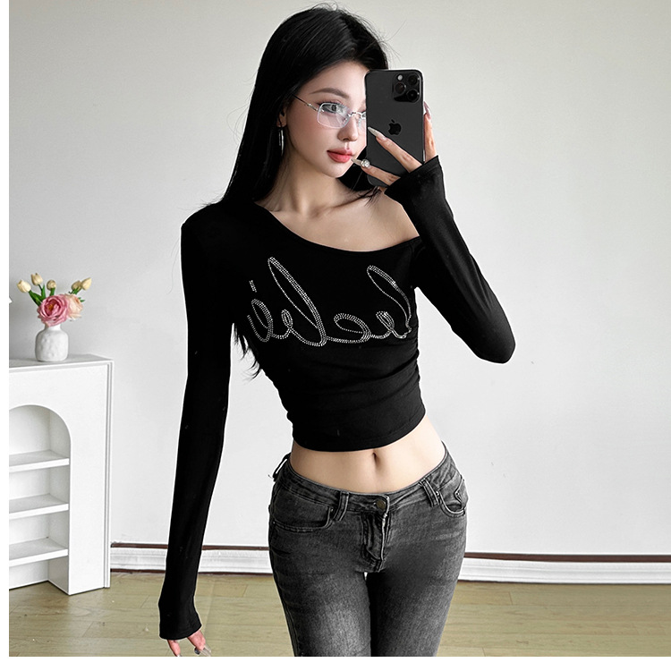 女性用のシックなスタイルのウエストトップ、多用途のホットダイヤモンド斜め肩レター、甘くてスパイシーなフレンチホットガール長袖ピュアデューティTシャツ、アメリカンスタイル