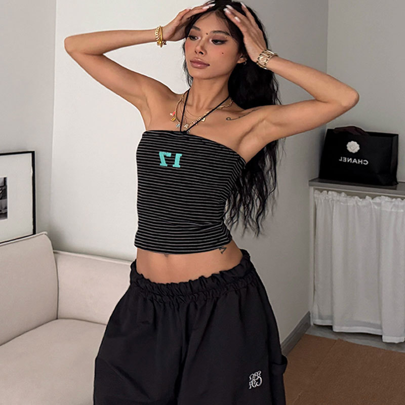 ホルターネック、トレンドの小さめバックレスタートップ、夏のストライプ、ユニークなニッチキャミソール、女性用アウターウェア、チューブトップ、美しい背中、シンプル